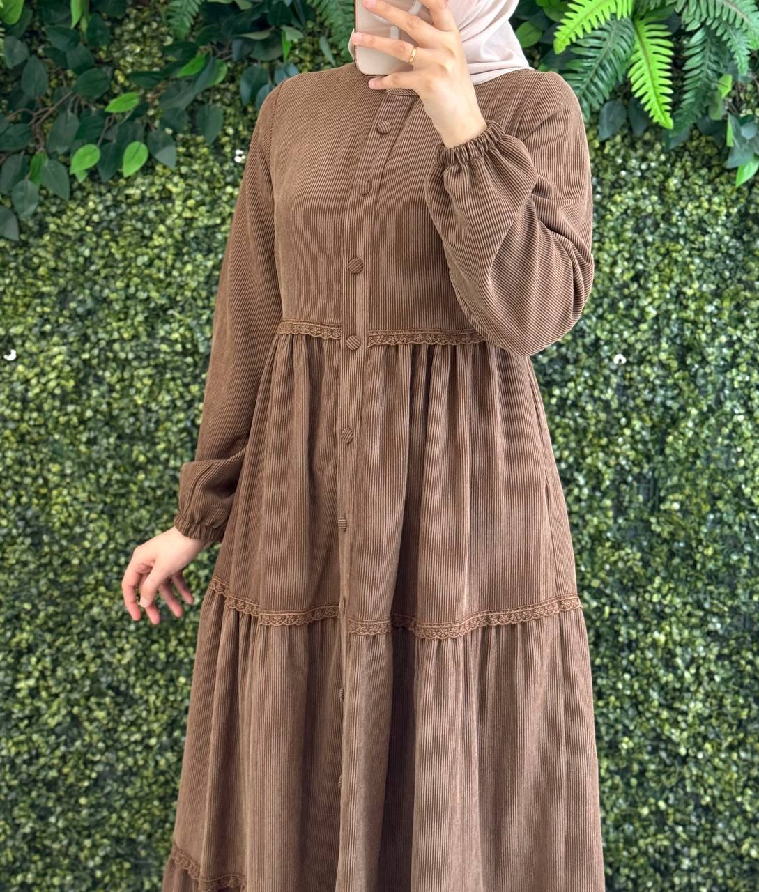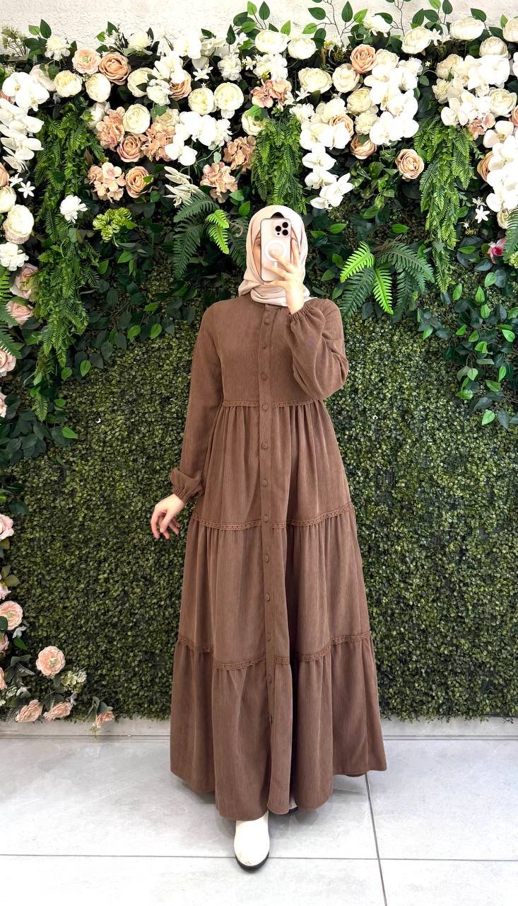 فستان أريج – فستان طويل بتفاصيل ناعمة وتصميم أنيق | بني