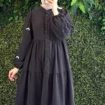 فستان “إشراق” بقماش شانيل الفاخر. يتميز بأكمام بتطريز زهور الأقحوان، مع تفاصيل الدانتيل الأنيقة على طول الأزرار الأمامية. تصميم واسع ومريح يضمن لكِ إطلالة محتشمة وأنيقة.