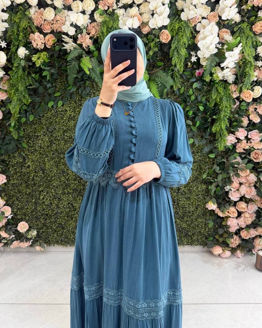 فستان جود صيفي بقماش كوبرا المميز، بتصميم طويل ومحتشم. يتميز بلمسة دانتيل فاخر، مثالي لإطلالة راقية في جميع الأوقات