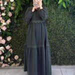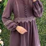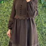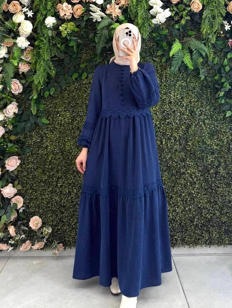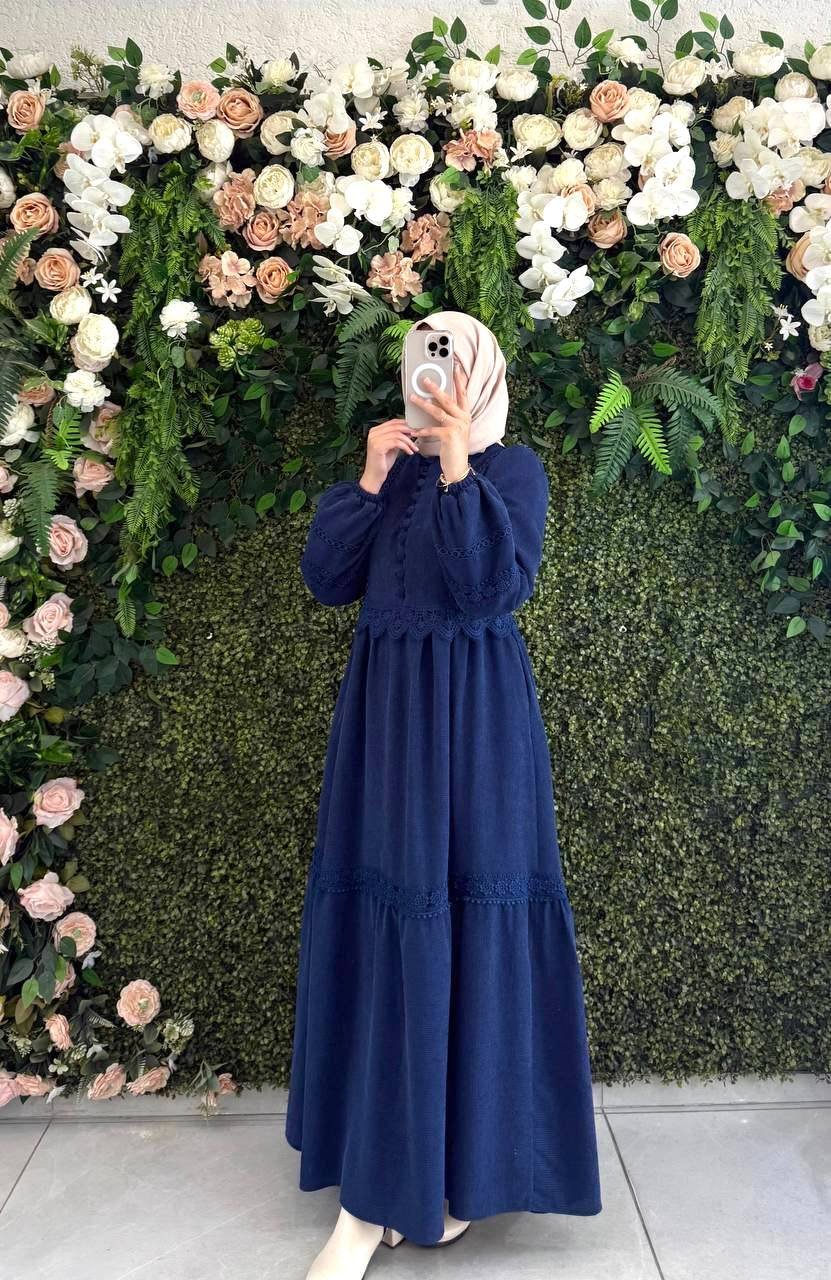 فستان جوري بأزرار أمامية وتفاصيل دانتيل فاخرة | كحلي