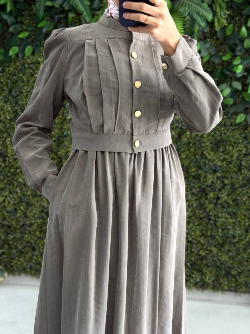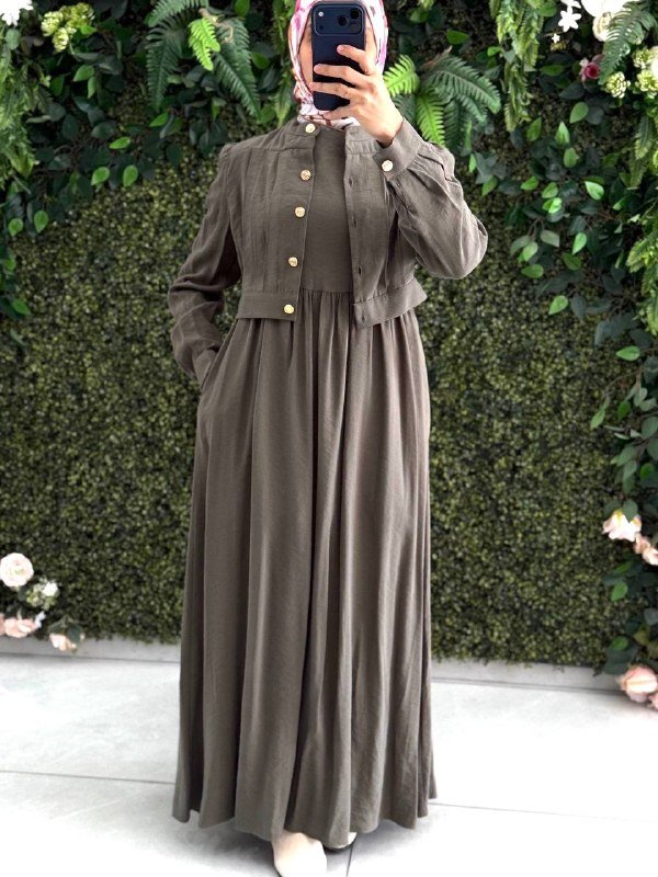 فستان جمان من قطعتين يجمع بين الاحتشام والرقي،. تضفي الأزرار الذهبية البارزة على الصدر لمسة فخامة، ليكون خيارك الأنسب لإطلالة مرتبة وأنيقة في كل وقت