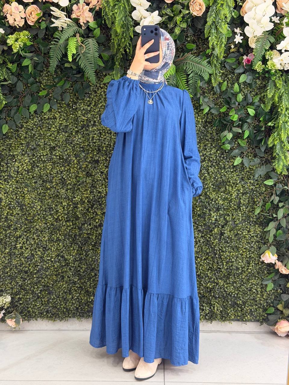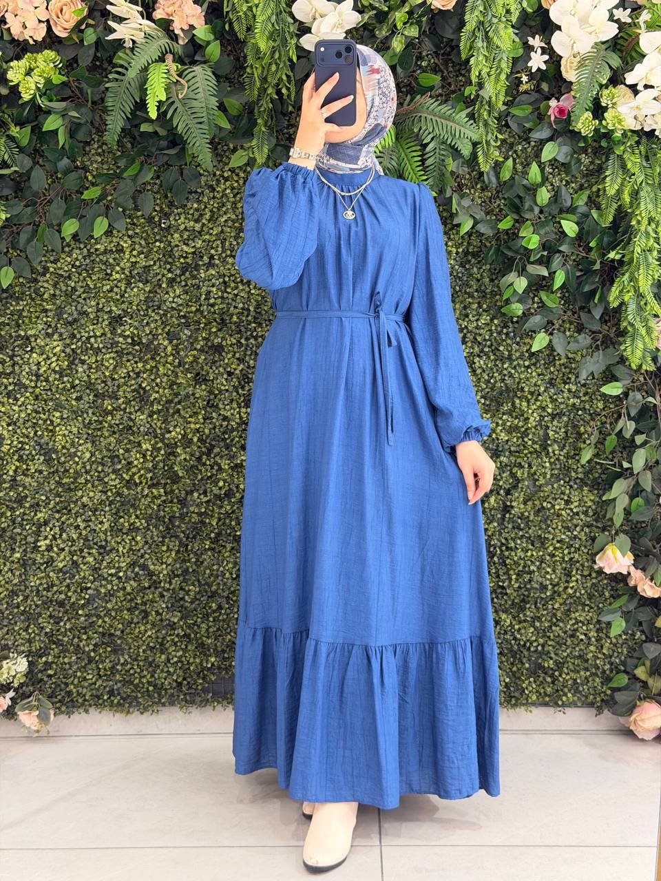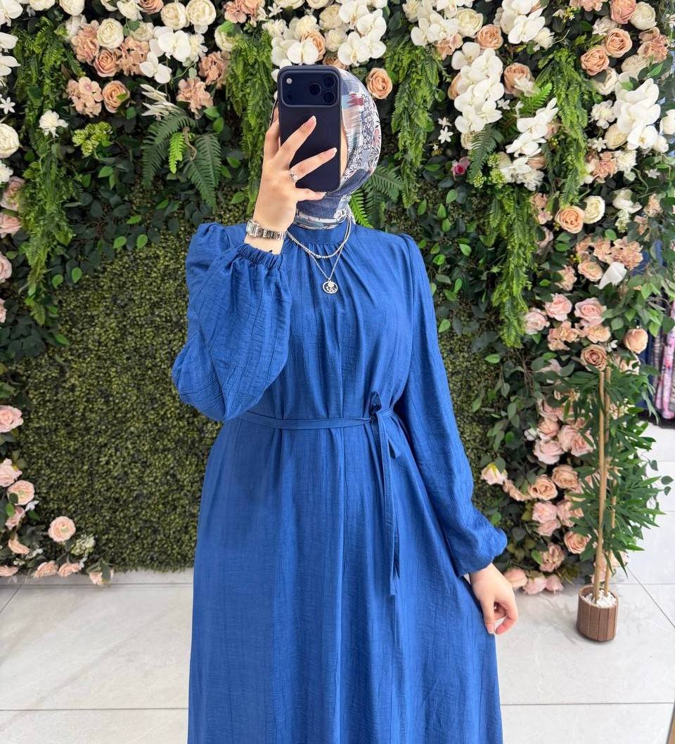 فستان لمى الراقي باللون الأزرق المميز. مبطن مع حزام لراحة وأناقة يومية