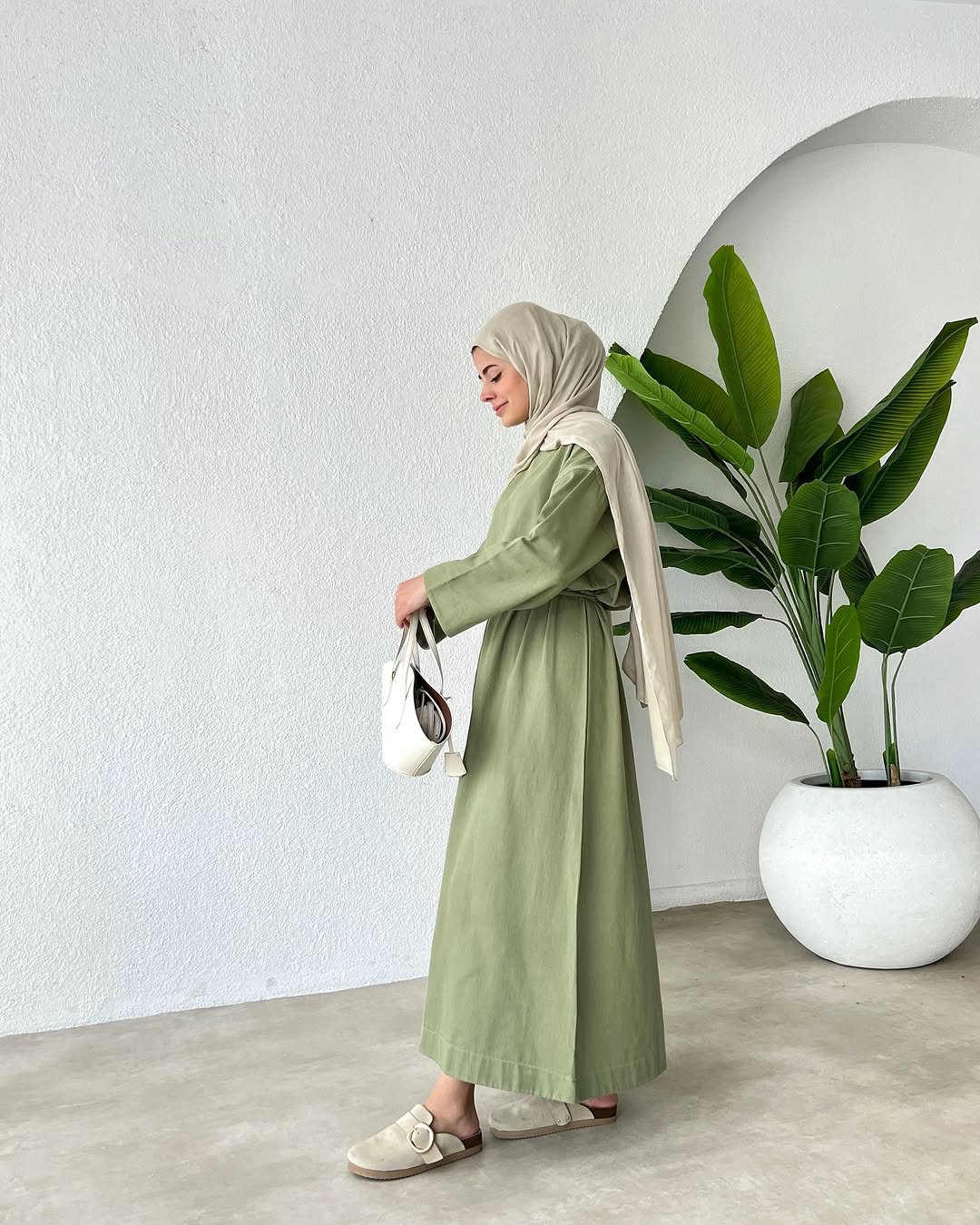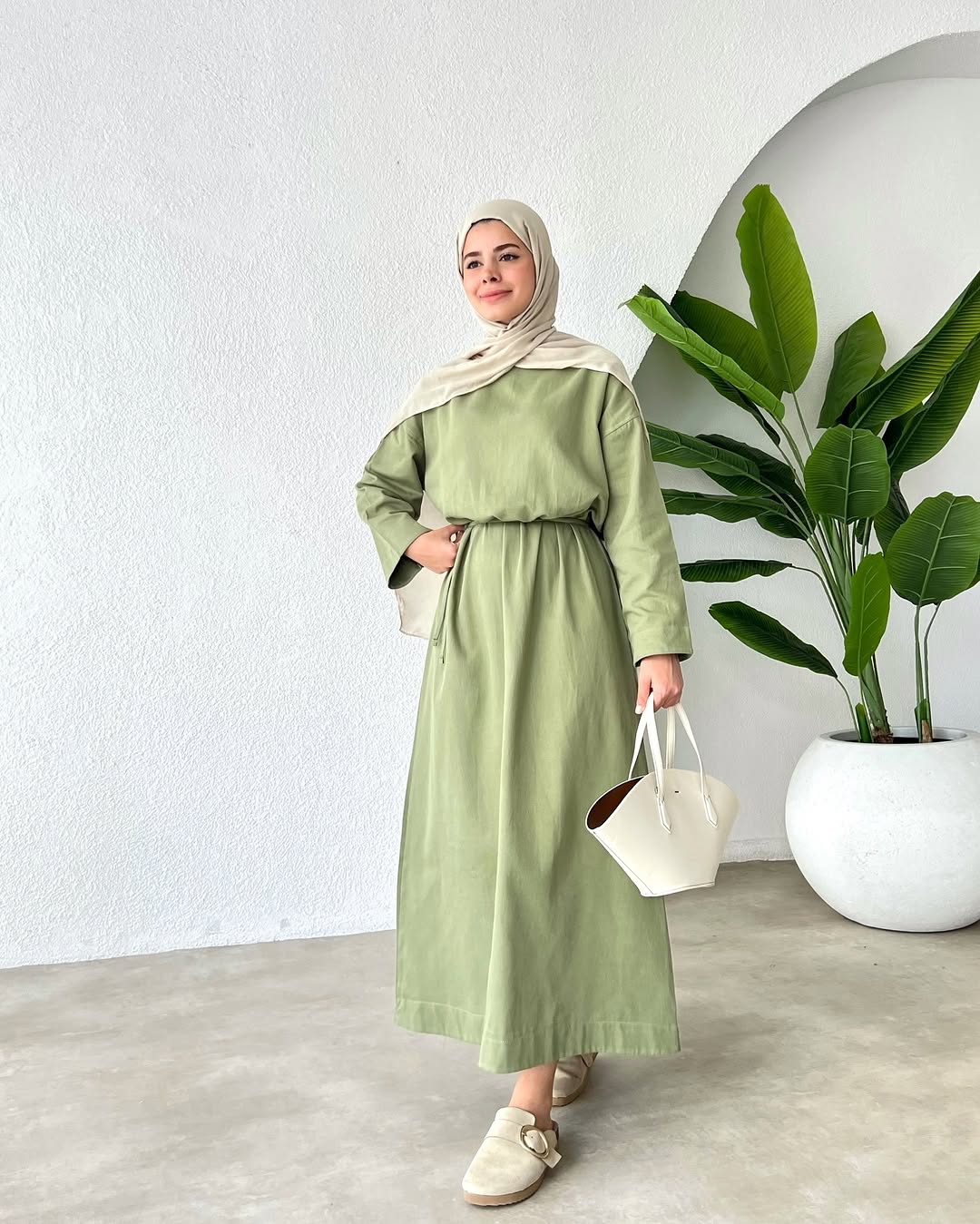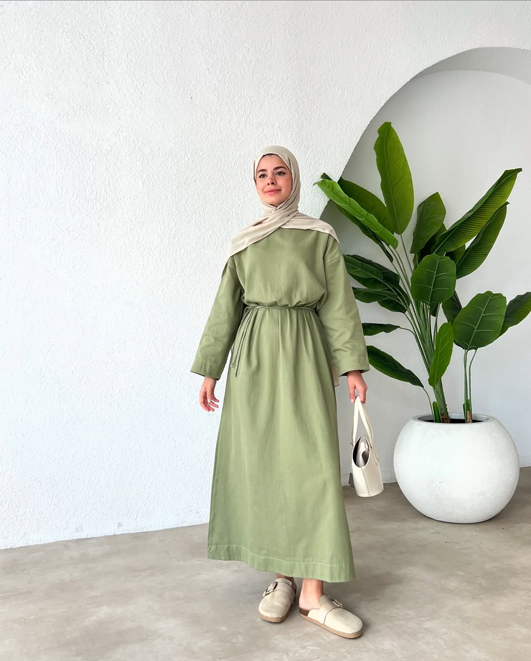 فستان مصمم بقصة مريحة وواسعة تناسب جميع الأذواق، يأتي الفستان بلون فستقي هادئ، مزوّد بحزام أو يمكن ارتدائه بدون الحزام بكل أريحية