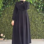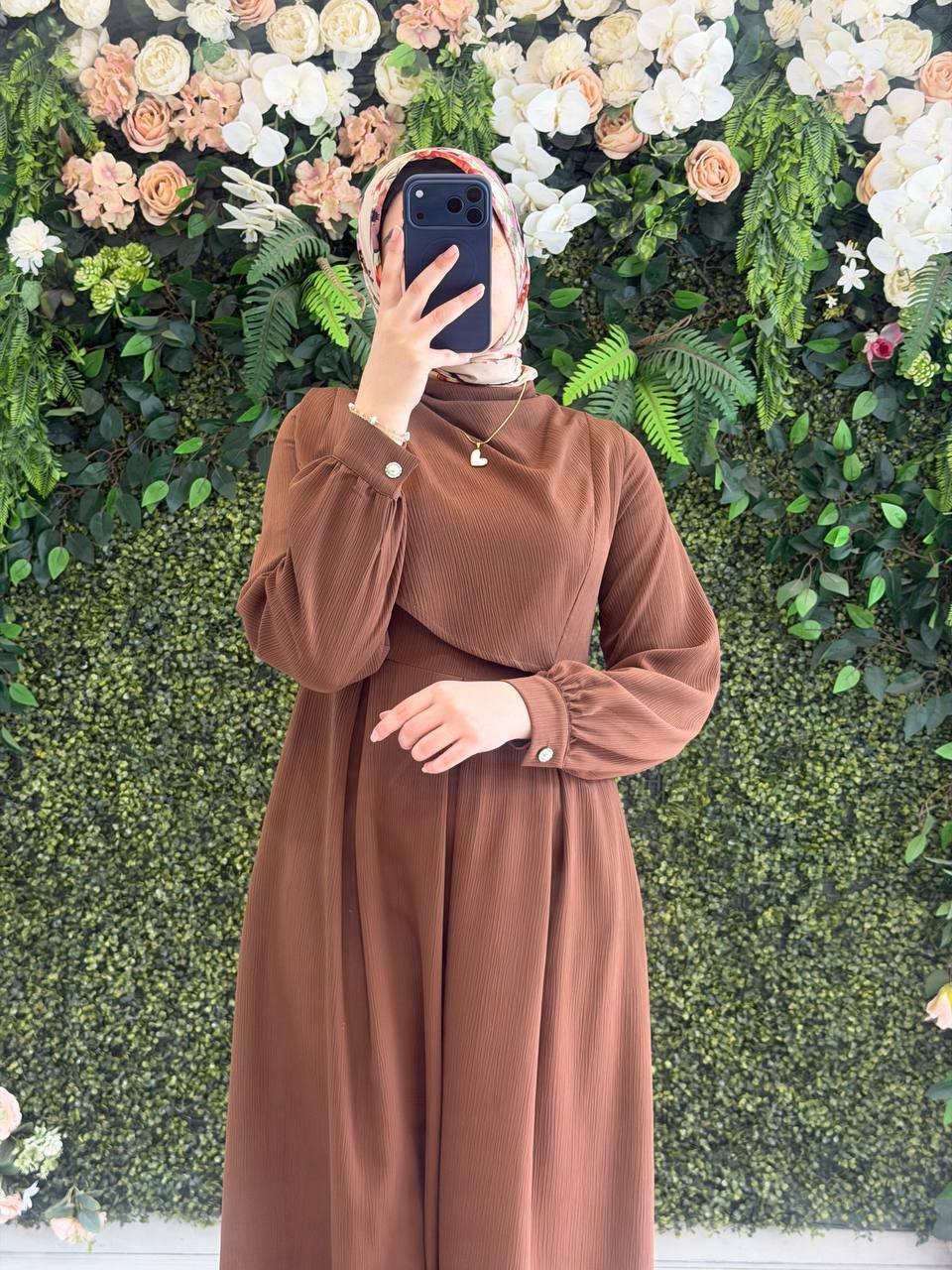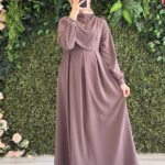 فستان ميس طويل يتميز بتصميم راقي وحركة ناعمة على الصدر. مما يجعله قطعة فريدة تجمع بين الحشمة والجمال العصري.