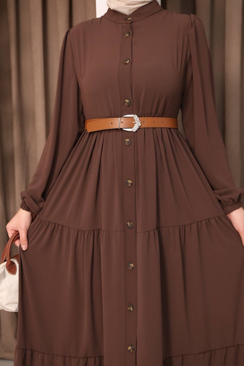 فستان لين، تمتعي بإطلالة محتشمة وراقية بقماش حرير المدينة الفاخر. يتميز بأزرار أمامية كاملة وقصة طبقات مريحة، مما يجعله قطعة أنيقة ومريحة.