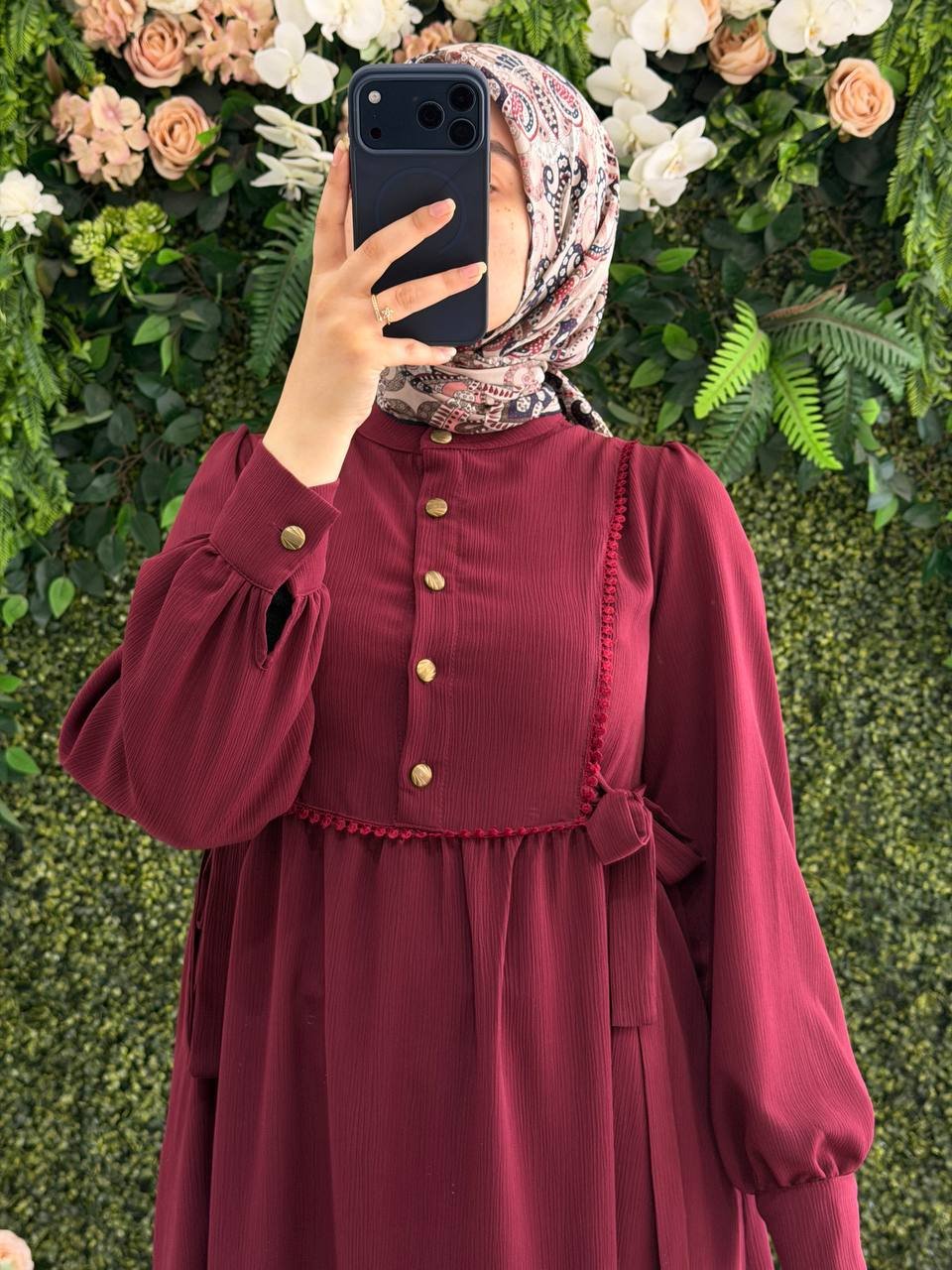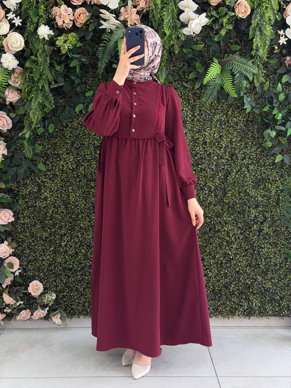 فستان سديم يتميز بتصميم راقي مع أزرار من الأمام وربطات جانبية ليضيف مزيد من الراحة. مما يجعله قطعة فريدة تجمع بين الأناقة والراحة اليومية.