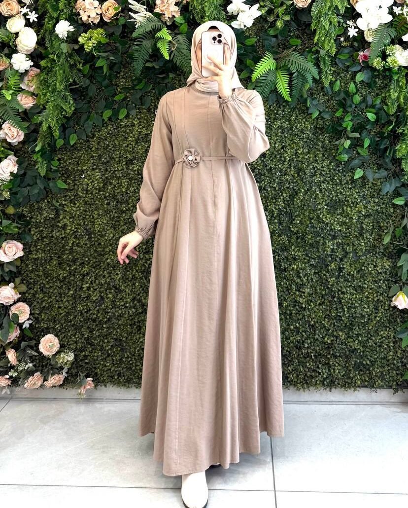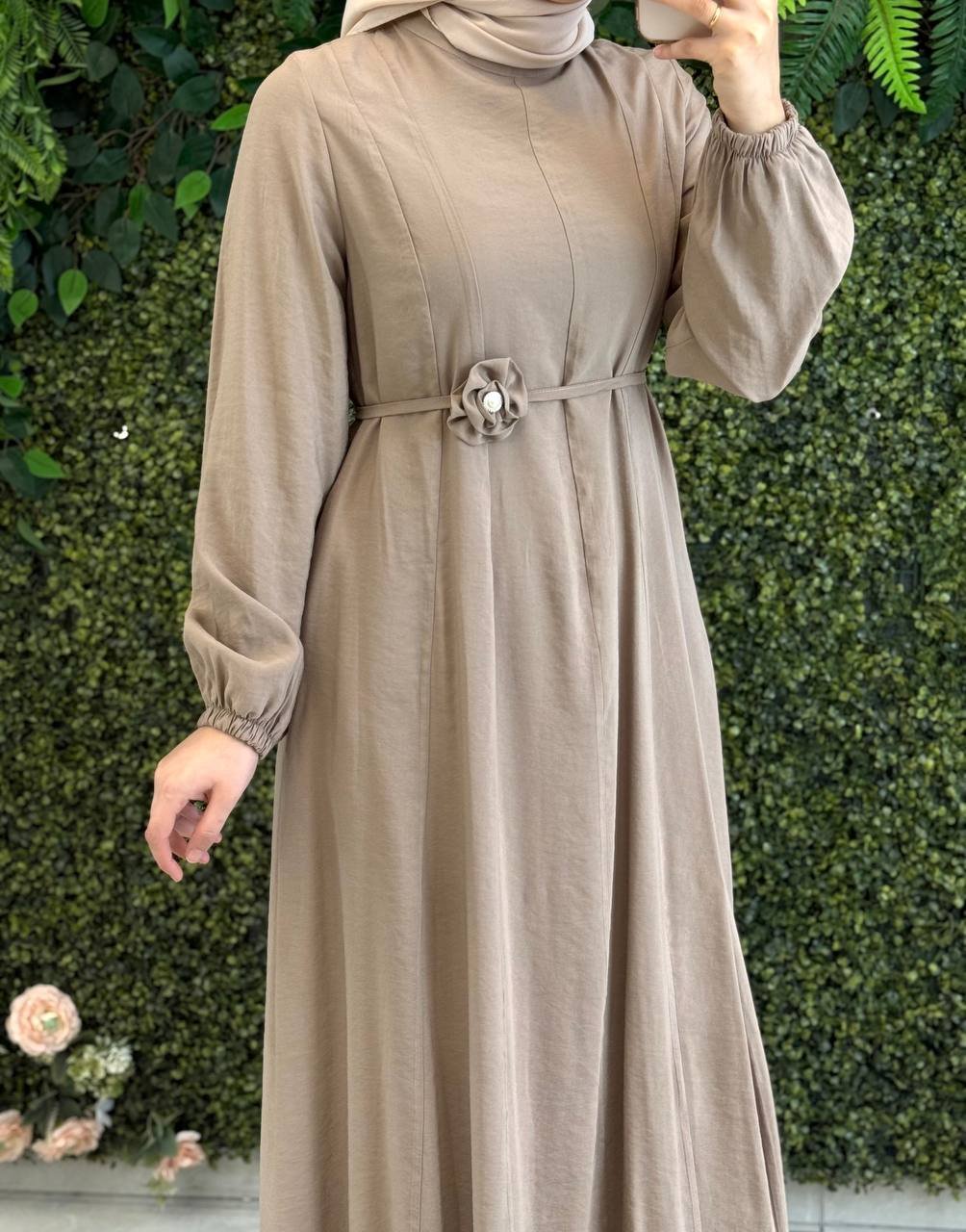 فستان وهج يتميّز بخطوط خفيفة تضيف لمسة أنيقة وطول، مع ربطة جانبية مزينة بوردة، يمنح الفستان أنوثة هادئة ومظهرًا راقيًا.